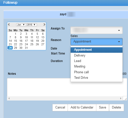 Once selected the Follow up pop up will appear on the Screen (pictured right). The user simply needs to Select the date of the next follow up from the calendar on the left and the follow up reason from the Reason drop down. Be sure to enter notes that are relevant to the next correspondence with the customer.