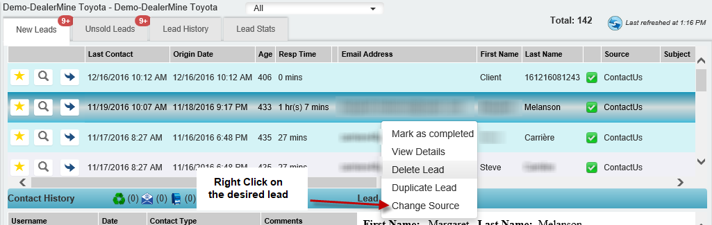 When on the Showroom Lead tab > New Leads, Unsold Leads, or Lead History, we have added the ability to Right Click Option "Change Source". When Change Source is selected a Change Source popup will display where the user will be able to pick an existing source from the Source drop down list (this list will reflect the new custom source names given on each lead when being Parsed) or click the "Add New Source" at which time the Source box will display blank and the user is able to type in the new source and Save.