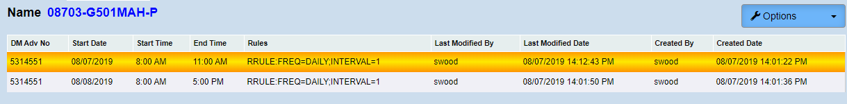 To make changes to the Work Schedule, select the Advisor's name in the Advisor list box, highlight any row and click the Options drop down. (See screenshot below)